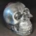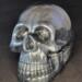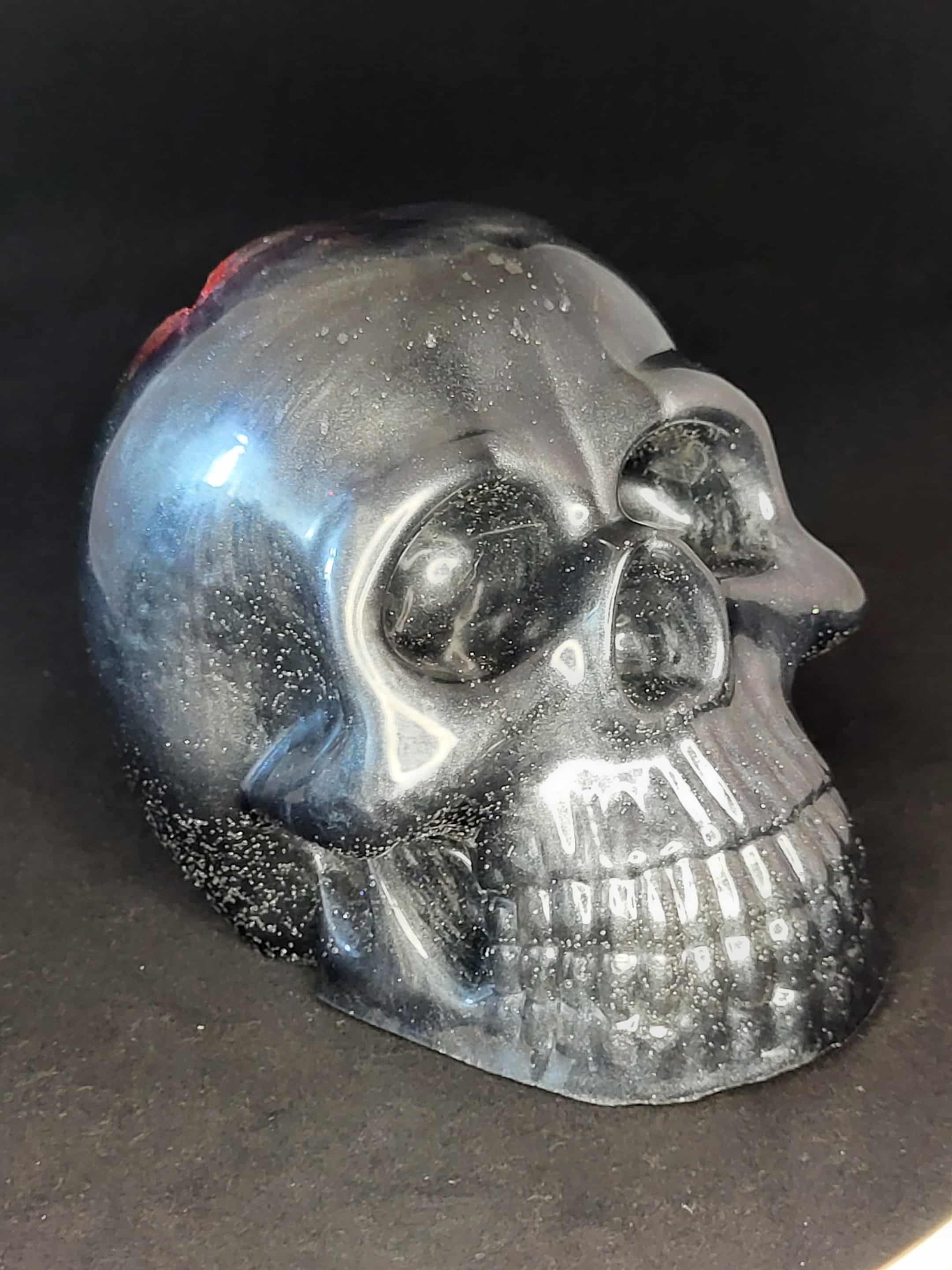 This skull is made from had mixed and poured resin. The silver black colorant was added to the resin. I added a druzzy to the mold and that created the hole or missing piece of the skull. I then adhered red glitter to the inside of the hole with UV resin giving it that sharp contrast that you see in the pictures.