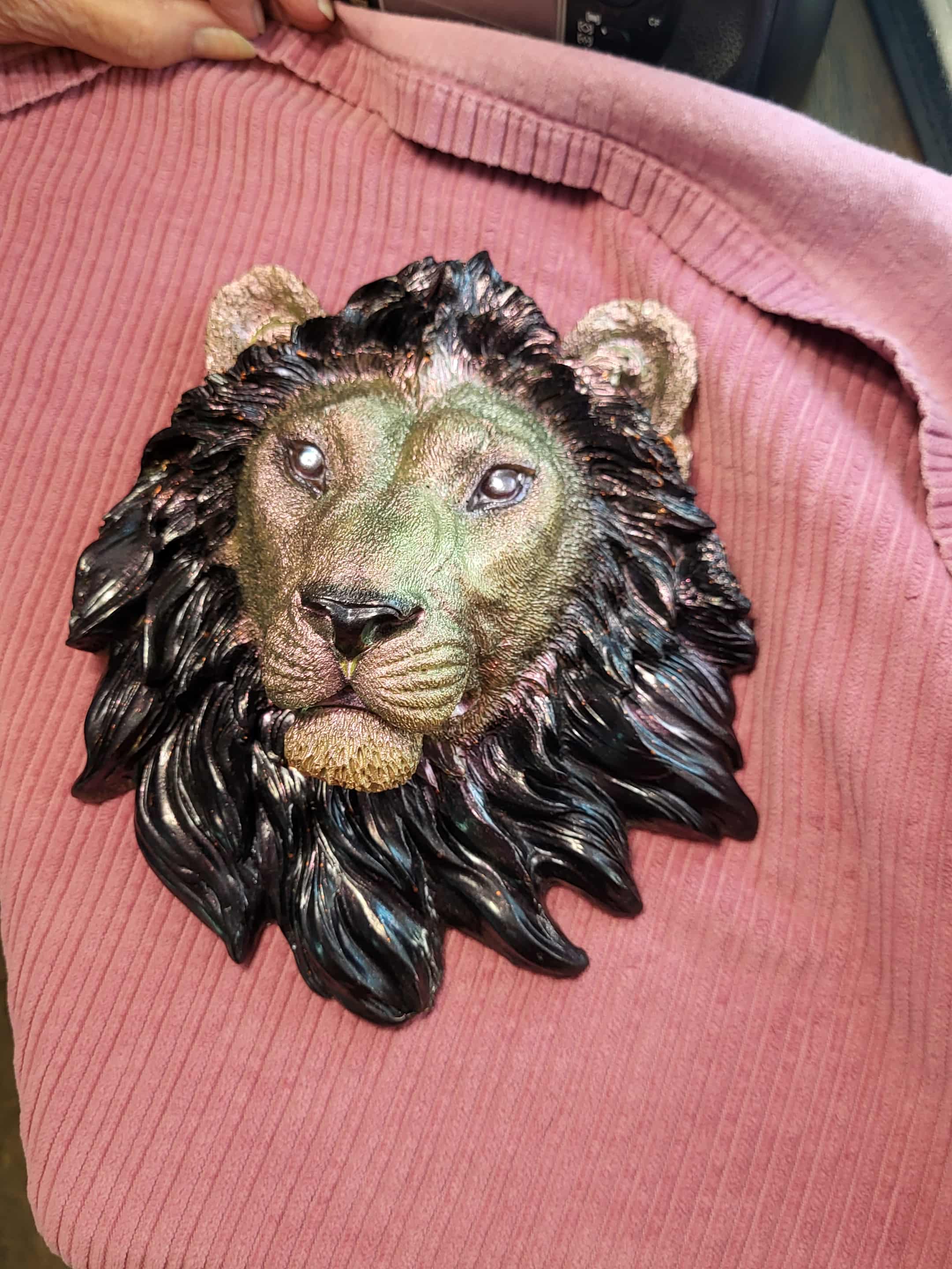 This fantastic lion is made from hand poured resin. I used a color shift colorant that has given life to this wall plaque. He will make a great edition to any home or space. He sparkles in the sun or under light.