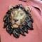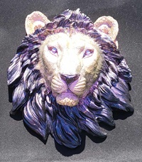 I use a mold and burnish the colors into the mold by hand. This takes a good bit of time to accomplish. Once I have that done then I mix the resin and pour it into the mold and wait for it to set. This particular lion has a black cherry color shifting mica powder for the mane and nose and eyes. I used a gold color shifting for the rest of the face. The gold shifts to a green when the light hits it at the right angle. Look closely at the pictures and you can see all the colors each one shifts to.