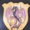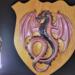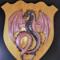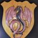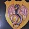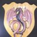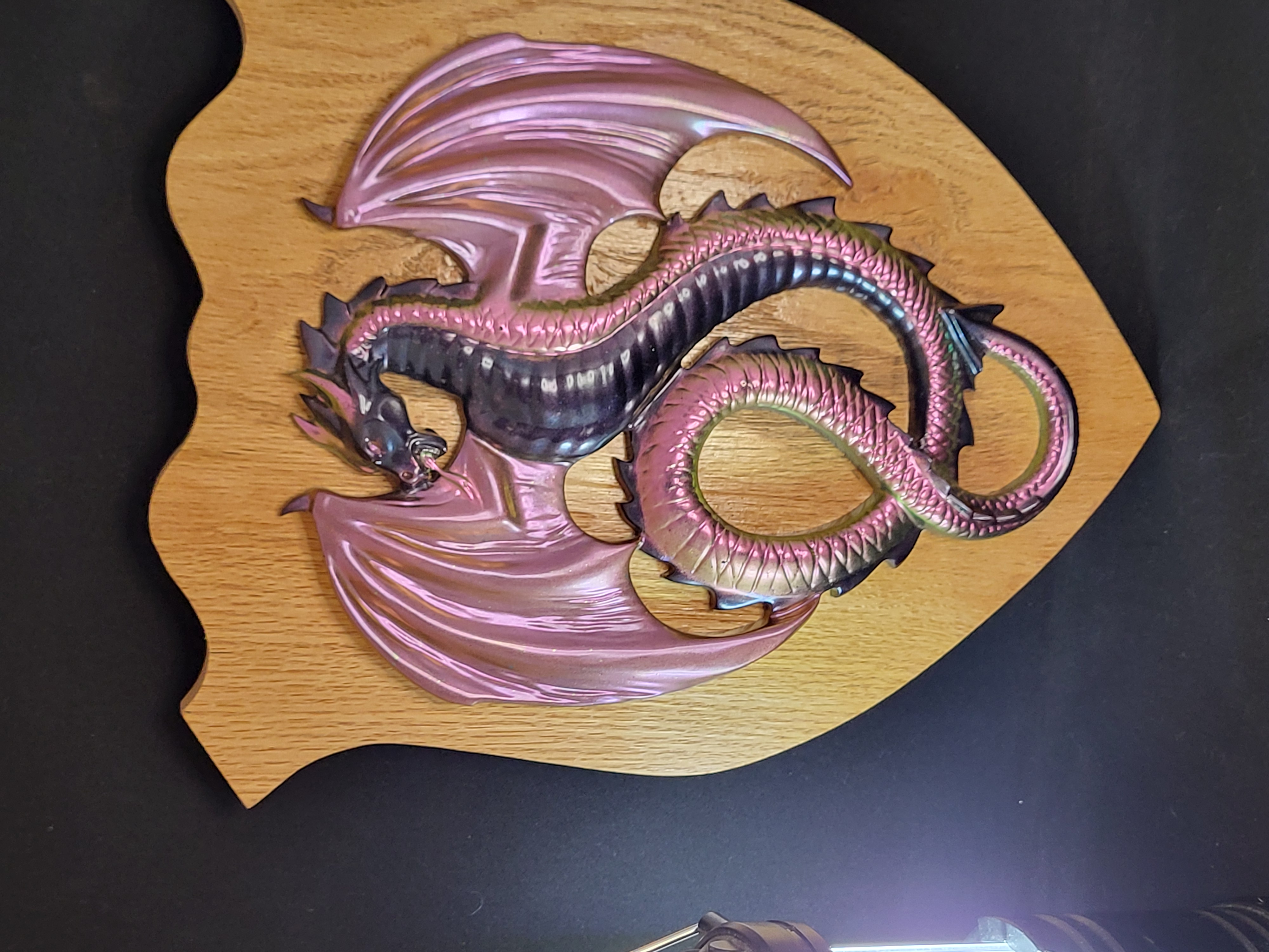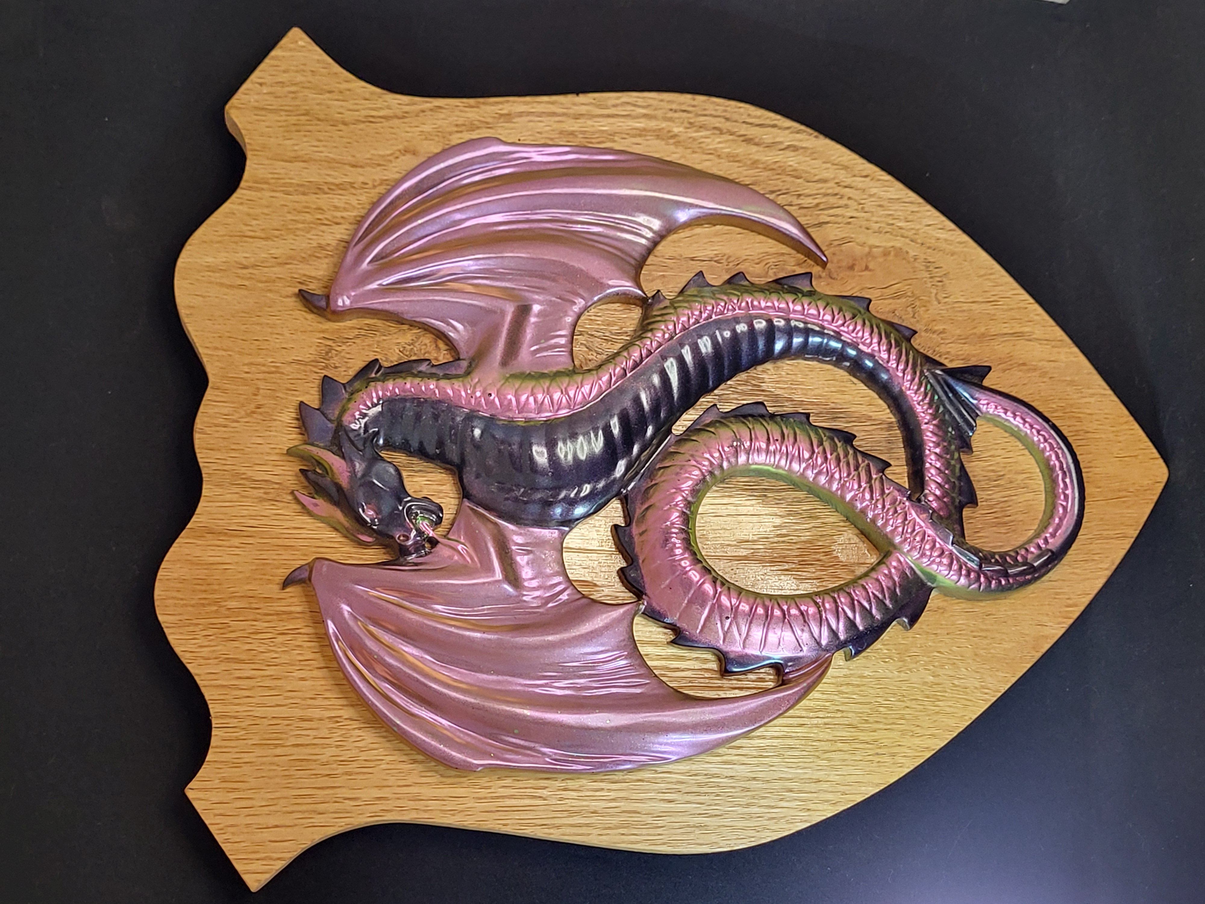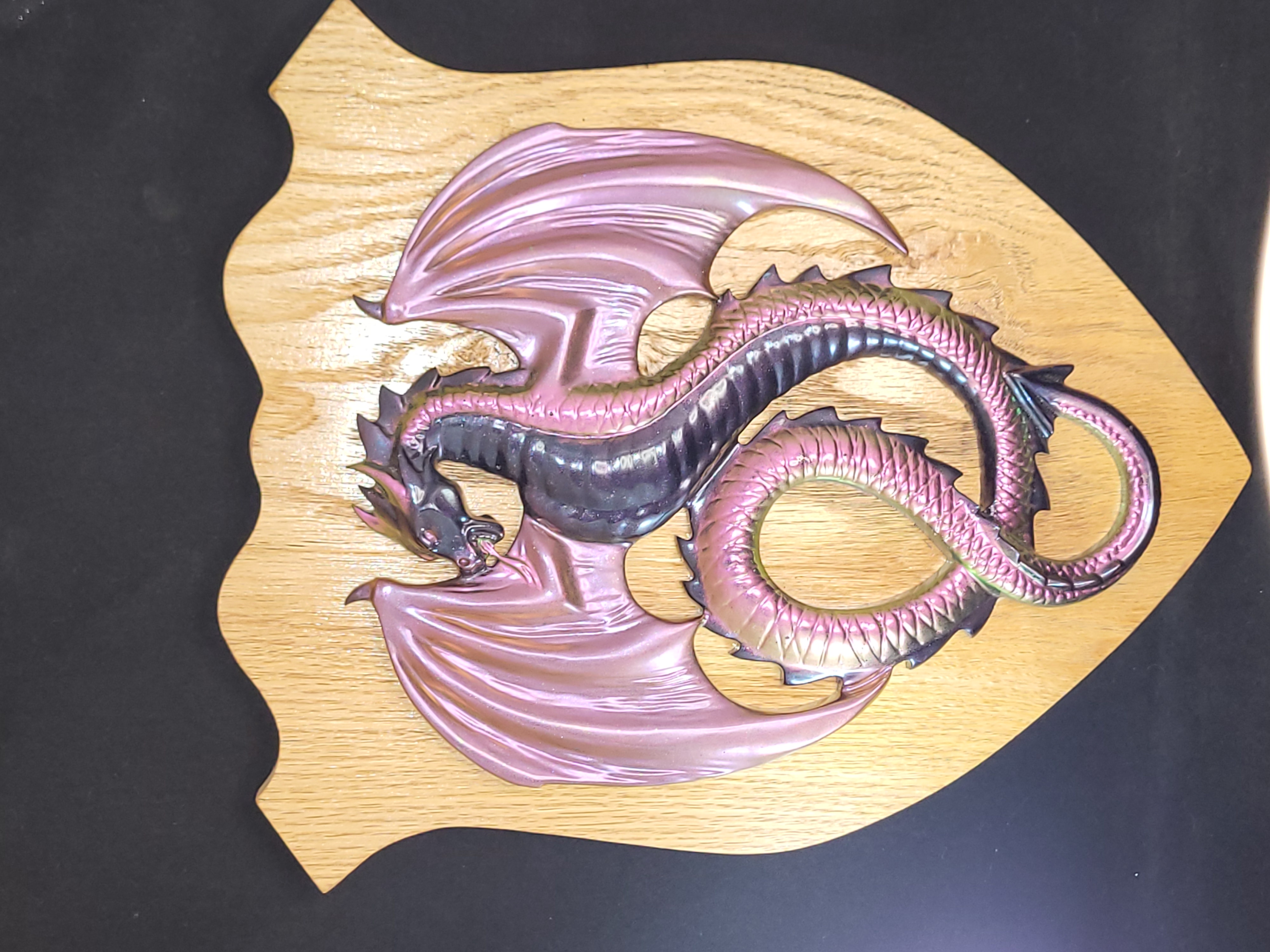 This Dragon is made from hand poured resin with chameleon powders to give it a color changing effect. The oak shield is reclaimed wood made by a collaborative artist.