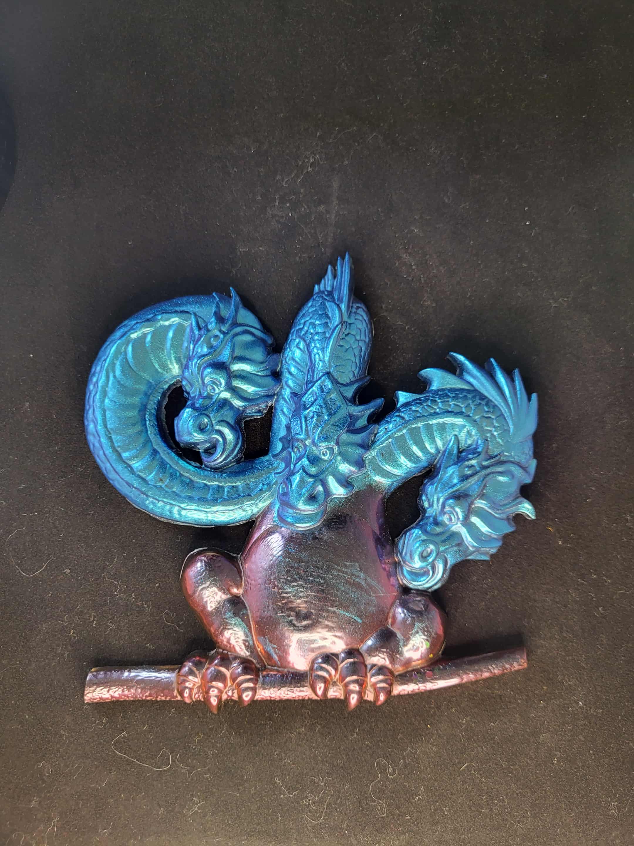 This three headed dragon is made entirely of resin. He has a striking blue chrome for his heads and a color changing black cherry body. He is mean to be put on an easel.